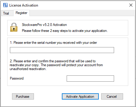 When you purchase a license, you will receive an email with the license serial number. License is issued for a single PC unless you have purchased multiple licenses. You can activate each license only once. Before you start, ensure that any antivirus software you might have haven't blocked StockwarePro from accessing the internet. You will need internet connection to activate and use the license.